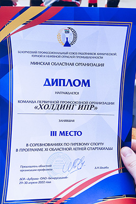 В соревнованиях по гиревому спорту команда Холдинга ИПР заняла почетное третье место. В личном зачете по гиревому спорту среди мужчин в категории старше 35 лет и свыше 80 кг первое место занял Толпеко Сергей Викторович, инженер по охране труда ЗАО «Солигорский Институт проблем ресурсосбережения с Опытным производством». В категории до 35 лет и до 80 кг Зубрицкий Максим Андреевич, техник-технолог ЗАО «Солигорский Институт проблем ресурсосбережения с Опытным производством», занял третье место.